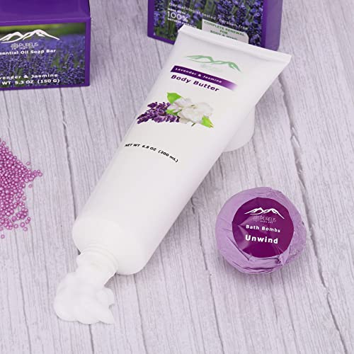 Lavender Physique Wash, Shampoo, Bathtub Cavier, Therapeutic massage Oil, Pores and skin Repairing Physique Butter, Aromatherapy Bubble Bathtub, Hand Cream, 3 Bathtub Bombs, Lavender Superb Perfume Mist, Bathtub Salts, Handmade Important Oil Cleaning soap Bar, Luxurious Spa Slippers, Spa Bathtub Mitts, Loofah, Wood Therapeutic massage Stick, Aromatherapy Candle and Bathtub Pouf