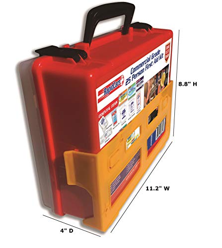 This premium commercial grade 25 person first aid kit exceeds OSHA and ANSI 2015 standards. It comes with 130 pieces, and is designed for most environments, including offices, fleet vehicles, manufacturing facilities and work sites.