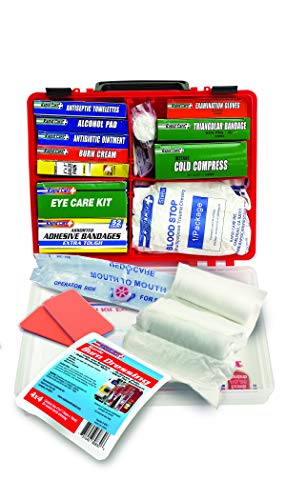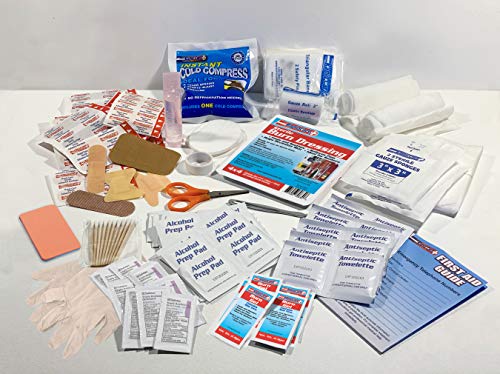 Package contains: 20 plastic bandages (1″ x 3″), 20 material bandages (1″ x 3″), 5 material knuckle bandages, 5 material fingertip bandages, 2 material bandages (2″ x 3″), 20 alcohol pads, 10 antiseptic towelettes, 2″ gauze roll, 4 gauze pads (3” x 3”), instantaneous chilly compress, triangular bandage, 2 security pins, 4 examination gloves, 2 trauma pads, blood stopper, CPR barrier, 2 finger splints, 10 applicators, 2 eye washes (15ml), 2 eye pads, tape roll, 10 antibiotic cream, 10 burn cream/gel packets, burn dressing (4″ x 4″), tweezers, scissors, first support information.